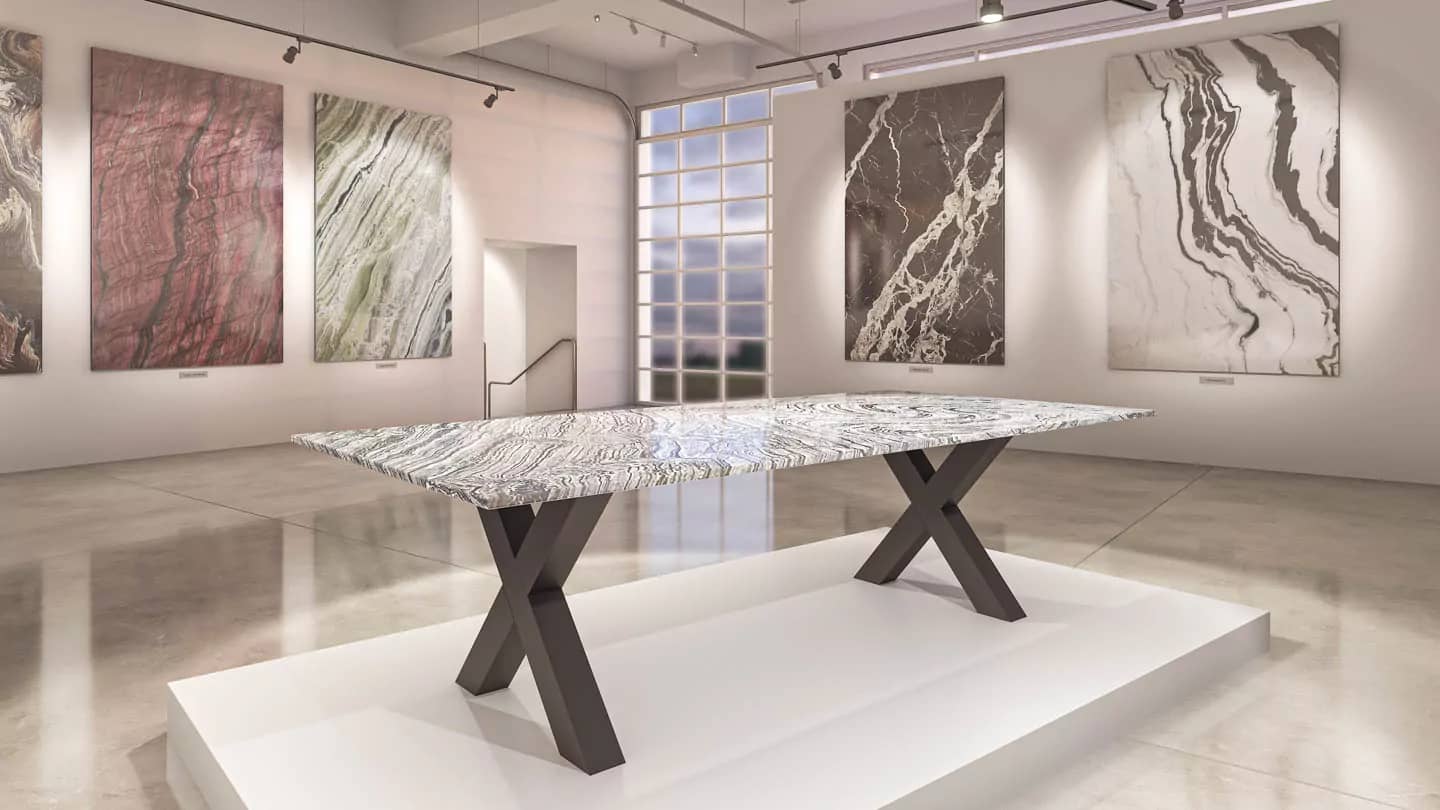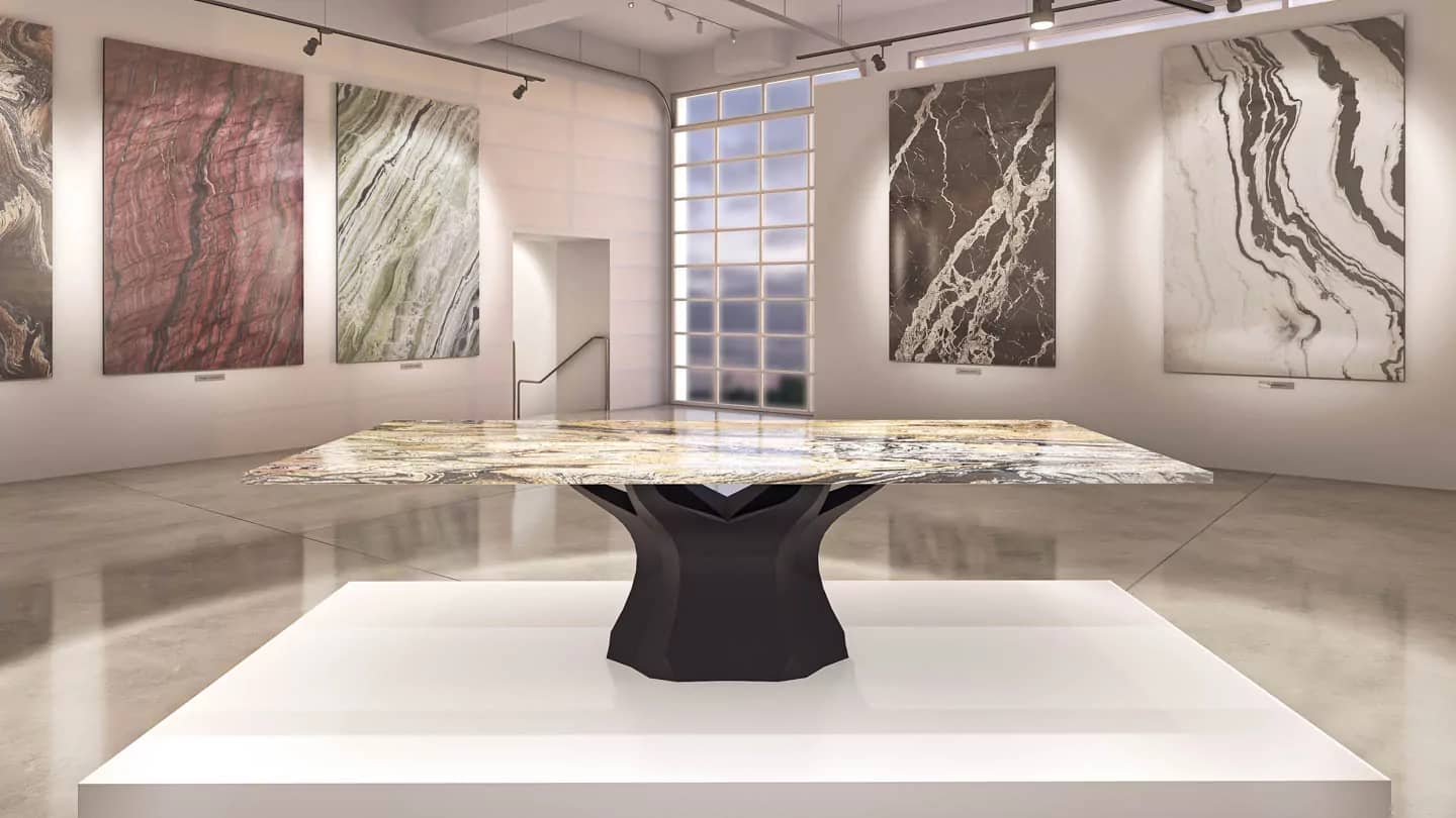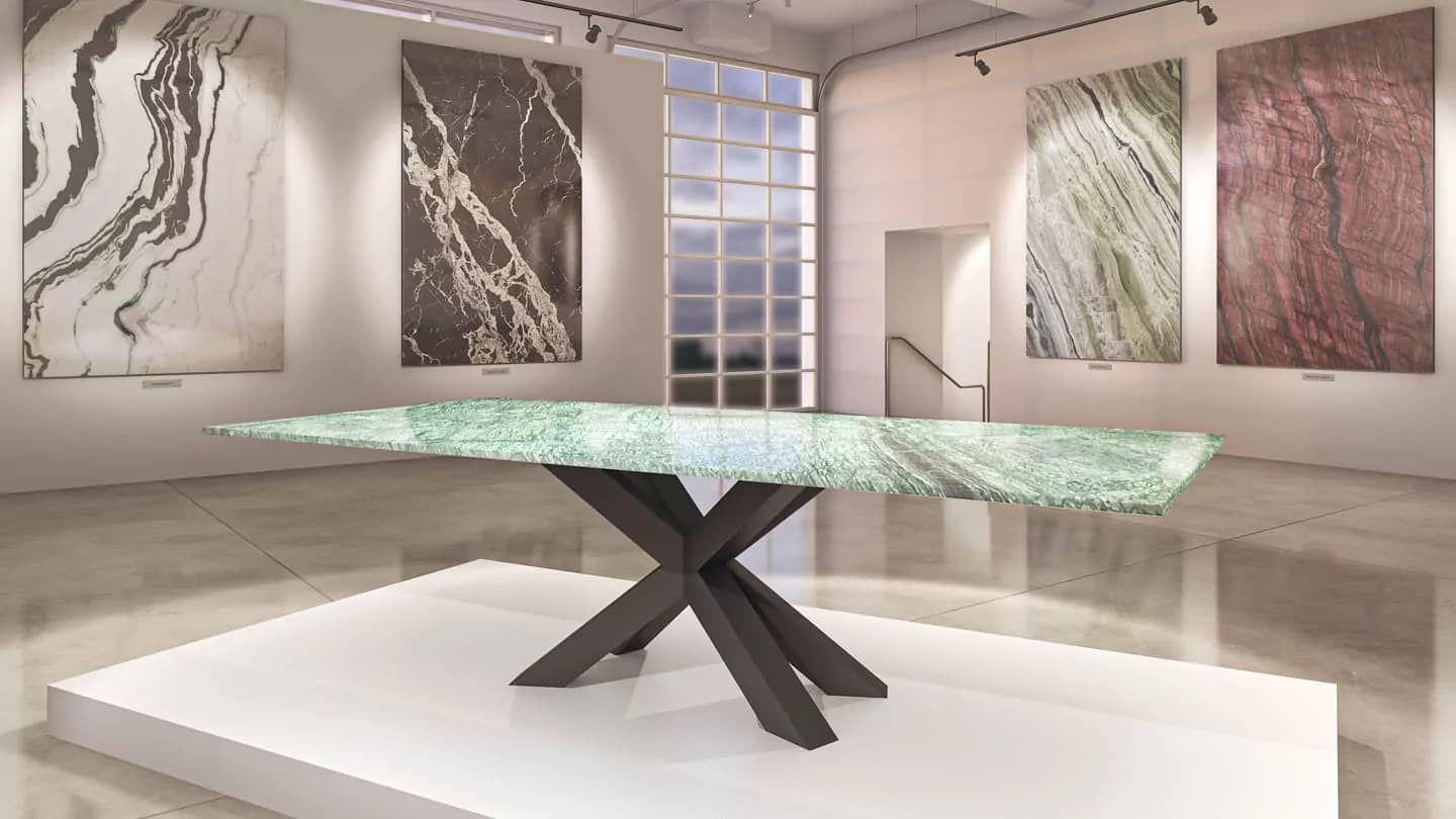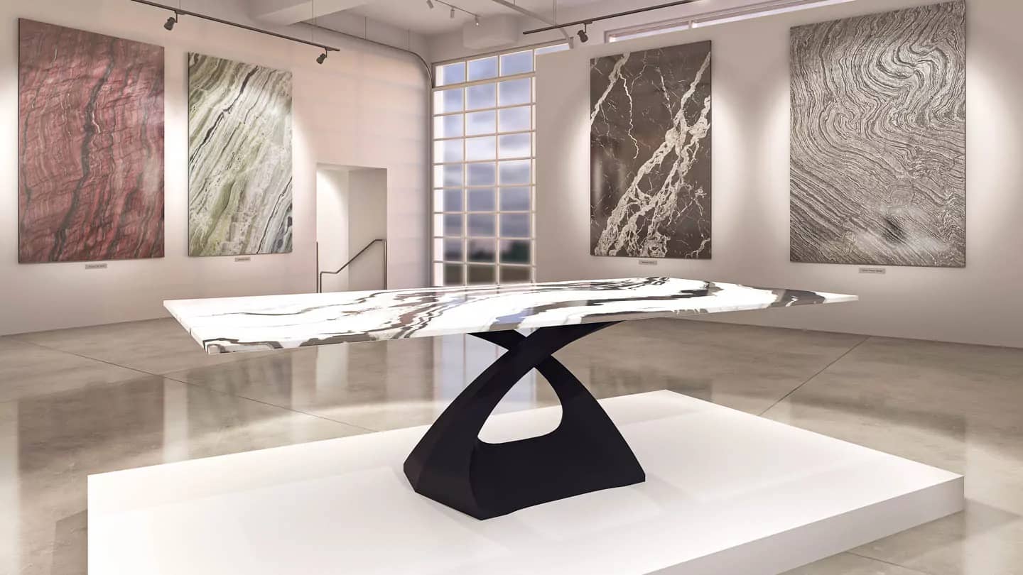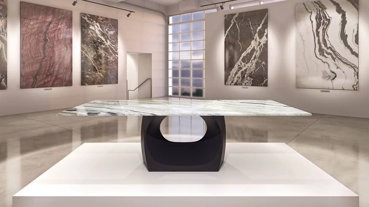 Наша тщательно отобранная коллекция включает в себя прекрасный ассортимент мраморных, гранитных, кварцевых и полудрагоценных каменных плит, готовых к использованию с любым из наших оснований для столов, чтобы они соответствовали вашему пространству и отражали ваш стиль.