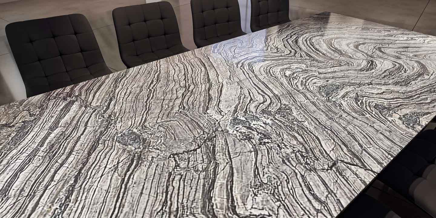Каменные плиты обычно довольно широкие, обычно от 1,5 до 1,9 м в ширину. Что касается длины, большинство плит имеют размер от 2,5 до 2,9 м, но есть и около 3,5 м. Если вы ищете очень большой обеденный стол из камня, мы можем предложить столешницы в книжном стиле: две зеркально отраженные каменные плиты, установленные встык. Вы также можете рассчитывать на толщину около 20-30 мм, в зависимости от плиты.